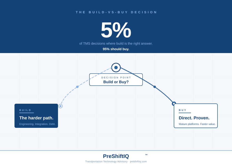 This is what PreShiftIQ™ does. Independent vendor audits across the TMS landscape. Buyer-side fiduciary advisory. Foundational alignment work that happens before any vendor demo. The assessment is free. The matching is fiduciary. The cost of getting build-vs-buy wrong is not.